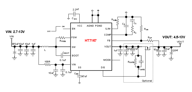 HT7167具有2.7V至13V寬輸入電壓范圍,可為采用單節或兩節鋰電池的應用提供支持。該器件具備12A開(kāi)關(guān)電流能力,并且能夠提供13V的輸出電壓。